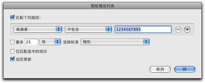 - 创建一个智能播放列表,名为“All Files”,规则是“表演者”不包含“1234567893”(或者随便什么别的你的库里不存在的表演者);