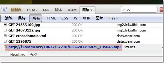 刷新页面点击虾米的播放按钮,在firebug的右上角搜索栏里输入“.mp3”这时firebug会自动定位到音乐的下载地址。如图: