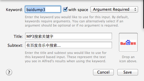 来演示下怎么添加个workflow,我想输入baidump3加空格就可以搜索我想要的歌曲,只要新建一个模板,如下: